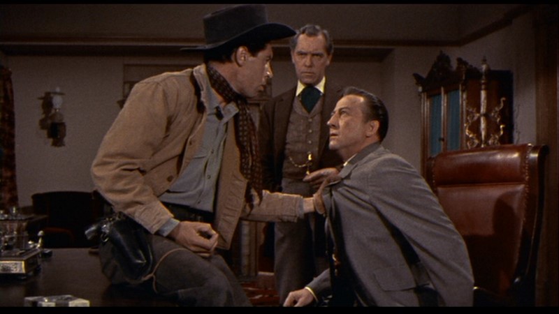 Lewis can’t resist, even in a color Western, some noirish tints, such as Marshal Scott sitting in his own cell with the shadow of the bars behind him. There are some snazzy camera angles and crane shots here and there, and attempts at sub-High Noonish themes. For example, the marshal’s wife cannot espouse the way of the gun and prefers to leave him, but finally does the right thing, understanding that a man’s gotta do etc. Paul Sawtell’s score is quite good, too, bringing an edginess to the proceedings. But really, it’s a predictable mid-budget Western which fades rapidly from the memory until you see it again, when you say, “Oh yes, that one.”