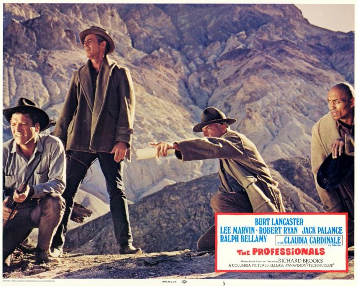 The Professionals is a 1917 caper movie and an adventure yarn, and is full of action. There are explosions and shooting galore. The screenplay (Brooks from a Frank O’Rourke novel) contains some terrific lines, especially the last one, although it also contains some rather pretentious pontificating on the meaning of life and so forth.
