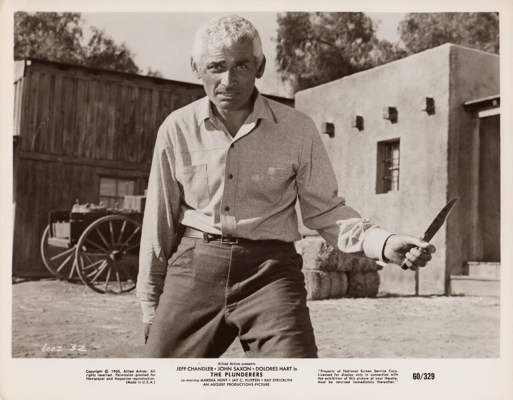 Prematurely gray Jeff was always good in our noble genre. He was noted for his Indians, of course. He seemed to alternate between being Cochise and an Army officer. In The Plunderers he is ex-Captain Christy, Civil War vet with only one working arm.