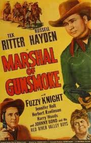 It’s a standard tough-marshal-cleans-up-the-town plot. Tex is naturally the marshal. Gunsmoke is a funny name for a moral town that despises outlaws but there we are. Tex’s brother (Russell Hayden) is a lawyer inveigled into defending the bad guys at the behest of the wicked rich rancher (Harry Woods) but he soon sees the error of his ways and joins the side of right and truth. Actually, Russell should have stuck to his guns (or gunmen) because Marshal Tex seems to want to deny the bad guys a defense and he thinks they are guilty till proved innocent, which wasn’t very proper for 1944 and even a touch unAmerican. Still, Tex wins and has a cheesy song (he croons it in the marshal’s office while they are voting, rather than on his horse). Mr Ritter looks a bit dudish in his costume riding his all-white stallion. Like Hopalong Cassidy, he goes for all black.