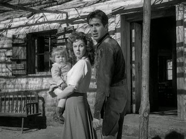 His three henchmen are played by Jack Elam, Dean Jagger and George Tobias, all terrific. It was one of Elam’s earliest parts and one of his best – even possibly the very best. Right from the get-go he appears as a manic, bloodthirsty villain, just out of two years in the pen, and that squint-eyed, splay-toed, stooping figure is all that we want Jack to be. The sheer evil glee with which he shoots at the baby girl (in a scene that would never be allowed nowadays) is one of the most memorable