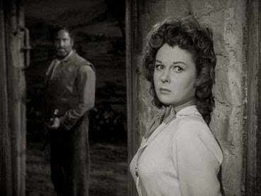 The only weakness in Rawhide for me was a bit where after the dull knife Power and Hayward have been using to chisel an escape-hole in the wall accidentally ricochets outside. Hayward uses a ruse to go out to that area with the baby in hopes of retrieving it, Elam and another henchman follow… and the scene ends with them spotting the knife in the kid’s hands. Instead of confiscating it and reporting it to Marlowe, following a bit of to-and-fro with Hayward they just leave it and she brings it back to Power! I know these guys are supposed to be dumb oxes but not that dumb surely! This was too implausible for me.
