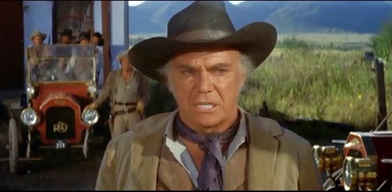 But there are little additions. It’s set in 1907, really quite late for a Western, and the intro shows us modernity, with pictures and voiceover describing Albert Einstein, modern technology and fashions, before slipping back to a generic Wayne West that could be any time in the 1870s or 80s. Automobiles are there, but only to be shown up as useless by comparison with the horse (see our post on Cars in Westerns) and, as in, say, The Last Hard Men, modern means of transport and communication are all well and good but when it comes to a revenge pursuit, they are feeble by comparison with a good ole mounted cowboy with his six-shooter.