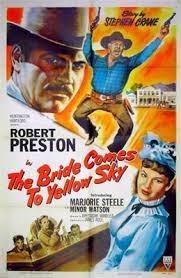 In 1898 Stephen Crane of The Red Badge of Courage fame published a short story in McClure’s Magazine entitled The Bride Comes to Yellow Sky. It tells of Texas marshal Jack Potter returning to his town of Yellow Sky with a new bride and coming up against the drunken gunfighter Scratchy Wilson, who has treed the town in Potter’s absence.