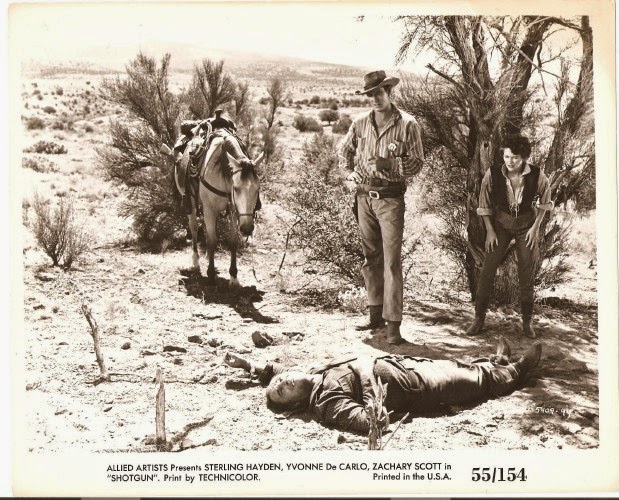 Tied to a tree to watch this gruesome fate is a tiresome saloon gal, Yvonne De Carlo (usually bad in Westerns). Hardin (eventually) frees them both but is soon obliged to gun down Bob Wilke. So Sterling and Yvonne ride on and meet a bounty hunter, Reb Carlton (Zachary Scott, suave baddy of countless movies, though rarely Westerns, and said to be a descendant of Bat Masteron, who knows, maybe he was), who is also after Ben Thompson. So from there on it’s bandits and Apaches and tough terrain, and much derring-do.