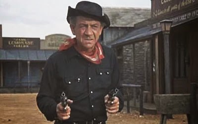 He arrives in Stodge City, a town run by prudish judge/mayor Burke (you probably know that berk is British slang for a fool), played by equally popular British comedy actor Kenneth Williams, whose American accent is even worse, so bad in fact that it is quite funny.