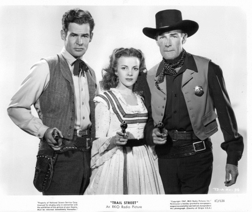 In my belief Robert Ryan was one of the greatest Western actors of all time, especially as the bad guy, though this was an early Western effort of his (he had had small parts in two oaters in 1940 but this was his first big role) and he doesn’t really shine all that much. He plays a good guy (he was also in another Scott/Holt movie when he was splendidly bad as the Sundance Kid in Return of the Badmen). But in Trail Street he is Allen Harper, capitalist with a heart of gold who is generously aiding Kansas farmers – for yes, this is a classic ‘honest homesteaders vs. greedy big ranchers’ plot.