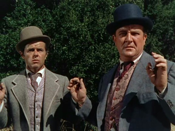 Thunder over the Plains is a post-bellum story set in Reconstruction Texas, finishing with the patriotic readmission of the Lone Star state into the Union, in, it must be said, a slightly saccharine scene. The hero (Randy) is a Union captain in what is bluntly described as an army of occupation, but though a decent soldier and firm believer in the Union, he is a Texan, largely sympathetic to the oppressed peoples. These ‘oppressed’ are naturally white, and cotton growers, and the only black people shown are two cheerful fellows cheering the anti-Reconstruction Rebels… Anyway, the language of the movie pulls no punches in its anti-Reconstruction stance, as was normal for Western movies: they had a very one-dimensial view of the period and saw no good in Reconstruction at all. The Northerners are all carpet-baggers and crooks. Elisha Cook Jr is a corrupt tax commissioner in league with dishonest Hugh Sanders, overtaxing the poor Texas farmers so they are obliged to sell their property cheap to Sanders, who then gives a cut to Elisha (though then they fall out).