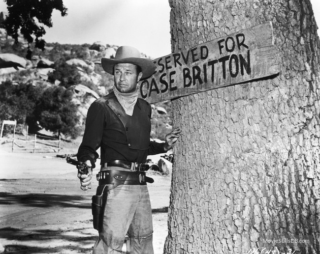 The opening shots of Noose are classic as the notorious gunman rides into town watched fearfully by the townsfolk. The gunman’s brother used to be marshal but was killed by Barton MacLane’s no-good sons, said sons being then dispatched by Jim. It’s a Wyoming setting: Rock Valley is between Casper and Laramie (Rock River is between those two towns today so maybe Rock Valley is that). It was filmed up on the Iverson Ranch in California, though, so it’s not that Wyomingish.