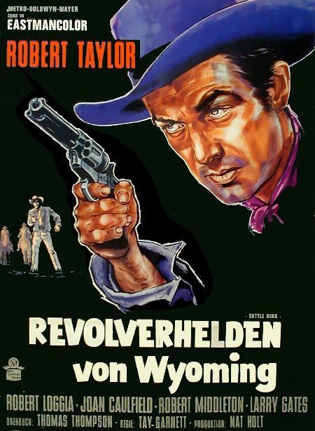 The MetroColor is bright and the picture quality on my DVD good. There are some nice (Californian) location shots (DP William E Snyder, of The Man from Colorado fame). There’s nice Paul Sawtell music. The movie was written by Thomas Thompson, also credited as an associate producer (his only film as such). Thompson was a TV writer (especially of Bonanza and Temple Houston) and only wrote two feature Westerns – the other was the screenplay for another Robert Taylor Western, Saddle the Wind, in 1958. The script for Cattle King isn’t bad, in fact.