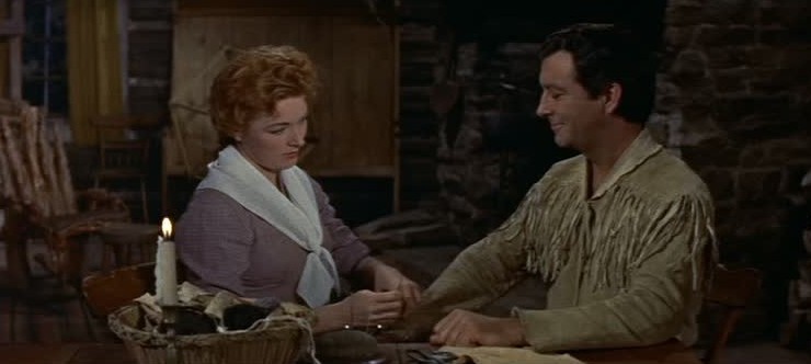 It reminds us in tone of the studio’s Seven Brides for Seven Brothers of the previous year, and the similarity is reinforced by the presence in Many Rivers of Russ Tamblyn and Jeff Richards. Not that Many Rivers is a musical; we are spared that anyway. There is only one song, crooned over the titles, though it is endlessly sung by characters, hummed and reworked orchestrally throughout the movie until we are heartily sick of it. But the two pictures look alike, with typical expensive but cheap-looking MGM studio work, garish colors, phony sets and slapstick ‘humor’.