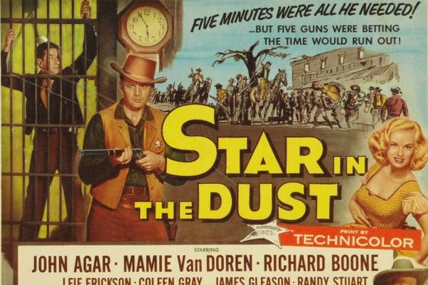 John Agar (left) first appeared in Westerns for John Fordin Fort Apache in 1948, with his wife Shirley Temple, and returned in She Wore a Yellow Ribbon the year after. So it was a five-star Western debut. After that he was rather miscast as one of Kirk Douglas’s deputies in Along the Great Divide in 1951 and had secondary roles in a Republic Rod Cameron picture, Woman of the North Country, in ‘52 and an independent low-budget movie, The Lonesome Trail, in ’55. So he had some background in the genre. Star in the Dust, a reasonably well-budgeted Technicolor offering from Universal, was his first Western as lead. He was OK, I guess.