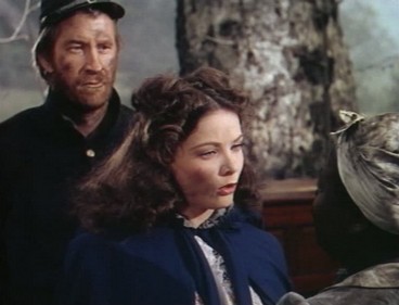 As for the rest of the cast, Dana Andrews was billed third, as the Union major rival to Randy for the hand of the fair Belle. He had started with a smallish role in The Westerner and a bigger one, as Fremont, in Kit Carson in 1940. He wasn’t quite yet a big Western star, though soon he would be fine as one of the lynched men in The Ox-Bow Incident (1943) and he would lead in the classy Jacques Tourneur picture Canyon Passage (1946). He’s good in his rather limited part of the rather rigid Army officer who burns down Belle’s stately home when she shelters a wounded Sam Starr.