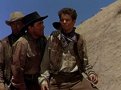 Arizona Territory, 1880. Bandits hold up a train and get away with the US Mail pouches stuffed with gold. They are followed into their secret hideout by a posse led by Hugh Sanders. There they find a young boy, Pete Carver (Russ Tamblyn, 16, in his first Western, three years before making it big in Seven brides for Seven Brothers). The sheriff slaps the boy about the face to find out where the gold is and in a rather sweet 1951 way this is masked from us viewers by a cave outcrop so we won’t have the trauma of seeing a child beaten. But the lad won’t tell where the gold is. Does he even know?