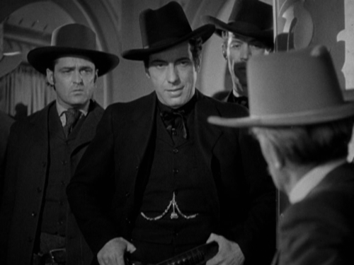 Of course it has its moments. It isn’t all bad. For one thing, Bogart whips out a derringer (just as he had in Virginia City) to shoot a good guy (who had to die because his gal had fallen for Cagney). Any Western in which a crooked saloon boss uses a derringer goes up in my estimation. And there are all manner of character actors, our old friends, to spot and enjoy: Ward Bond is a henchman, and leader of the lynch mob. Trevor Bardette’s there, as another henchman, Indian Joe, John Miljan is Ringo and Edward Pawley is Doolin. Irving Bacon is the hotel clerk. And guess what? Earl Dwire the Great is the relay station man (though tragically uncredited).