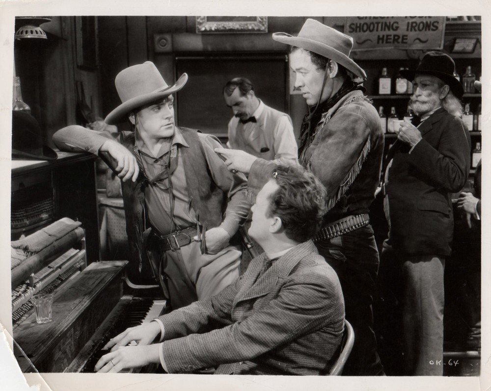 But it’s still pretty bad. Warners got Lloyd Bacon (left) to direct. Bacon did direct some big Warner hits such as 42nd Street and Footlight Parade but he was so overshadowed by Busby Berkeley in those that no one really noticed him. After a career in silent movies as an actor (he was often the heavy in Broncho Billy oaters) he joined Warners in 1925. His ability to bring in a film on time and on budget earned him respect from the five Warner brothers and he was rewarded by becoming the highest paid director on the lot, earning over $200,000 a year throughout the Depression. Westernwise, though, his career was decidedly unstellar. He had directed a sort-of Western (but not really) in 1938, The Cowboy from Brooklyn, with Dick Powell (a tough-guy crime movie lead who did in fact make the transition, being very good in Station West; but Station West was really a detective yarn that happened to be set in the West) and the clunky The Oklahoma Kid was his second. He’d been an assistant to Ford on My Darling Clementine but doesn’t seem to have learned much and he would later make the turgid The Great Sioux Uprising. I’m afraid that he just didn’t seem to ‘get’ Westerns at all.