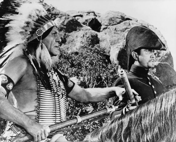 We open with a dastardly Mexican officer (John Marshall, about as Mexican as I am, and I’m not) offering rifles to the ‘Shoshonies’ to attack Yanqui wagon trains of settlers coming into Mexican California. As you know, those who provide Indians with guns in Westerns are on a naughtiness par with Benedict Arnold, John Wilkes Booth and Dr Crippen.
