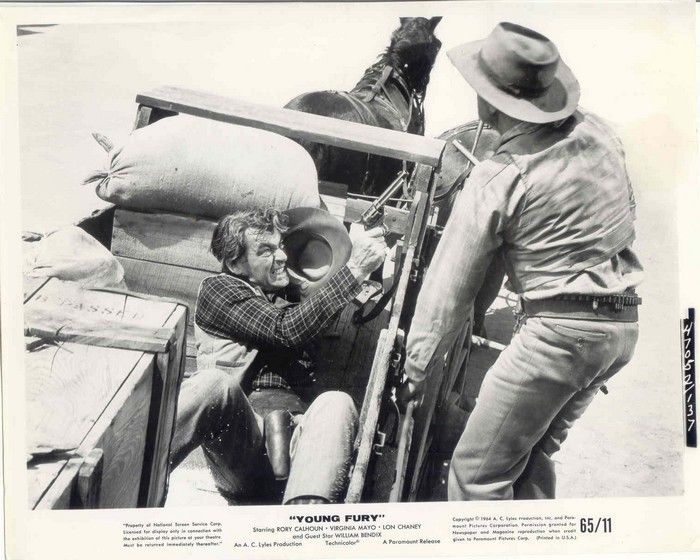 We’ve been reviewing recently some of those Westerns that producer AC Lyles (right) made for Paramount in the 1960s, the likes of Hostile Guns, Waco or Town Tamer, and another such was Young Fury. Lyles’s formula was to make traditional 1950s-style oaters with a cast of old hands,and this one starred the excellent Rory Calhoun, backed up by Virginia Mayo, Lon Chaney, Richard Arlen (who was in quite a few of them), John Agar and, in a very short cameo, William Bendix.