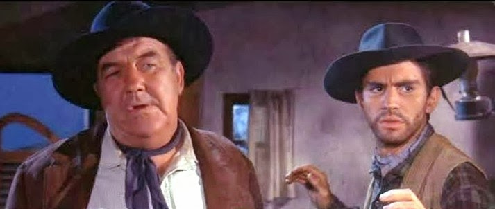 Accompanying him on the plane (it must have been a jumbo) was Broderick Crawford, now 55, who was in a similar position. He would only do an AC Lyles geezer-Western afterwards, Red Tomahawk, and a couple of Western TV shows and that was all she wrote. Crawford was never suited to Westerns, in my view, his quick-fire Eastern lingo and bulk being more appropriate in crime movies or a Highway Patrol car, but he did love oaters and he appeared in fifteen Western features, leading in three (including another spaghetti), as well as many TV shows. In The Texican he plays a typical crooked saloon owner in a frock coat (rather an ample frock coat).