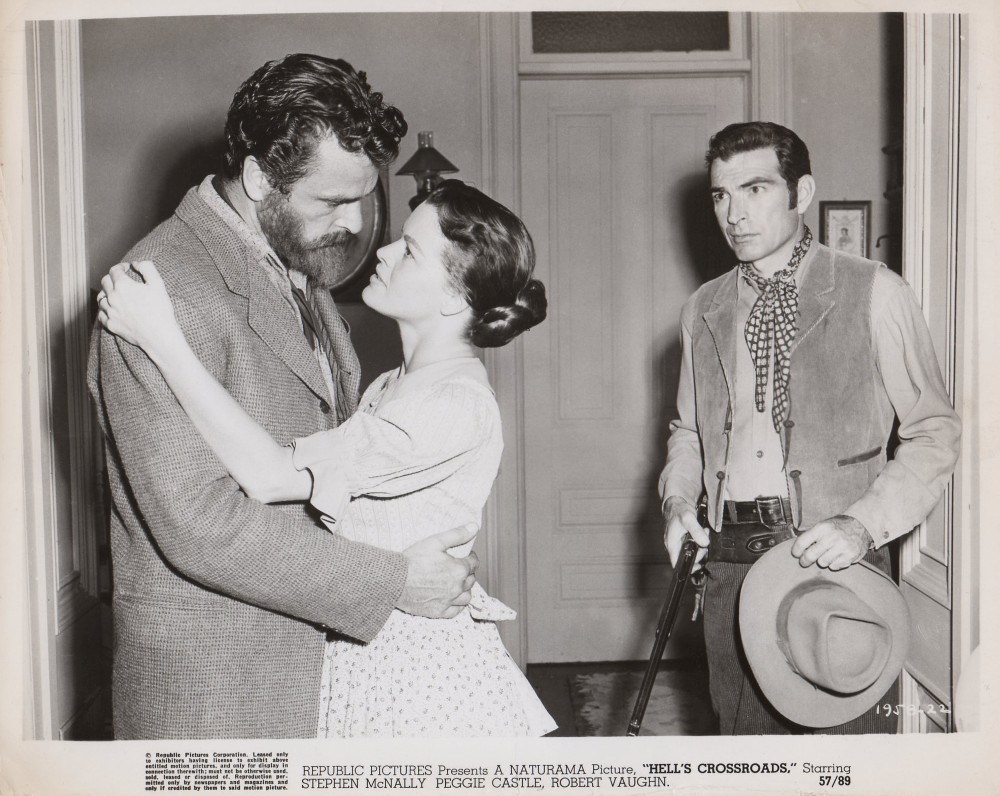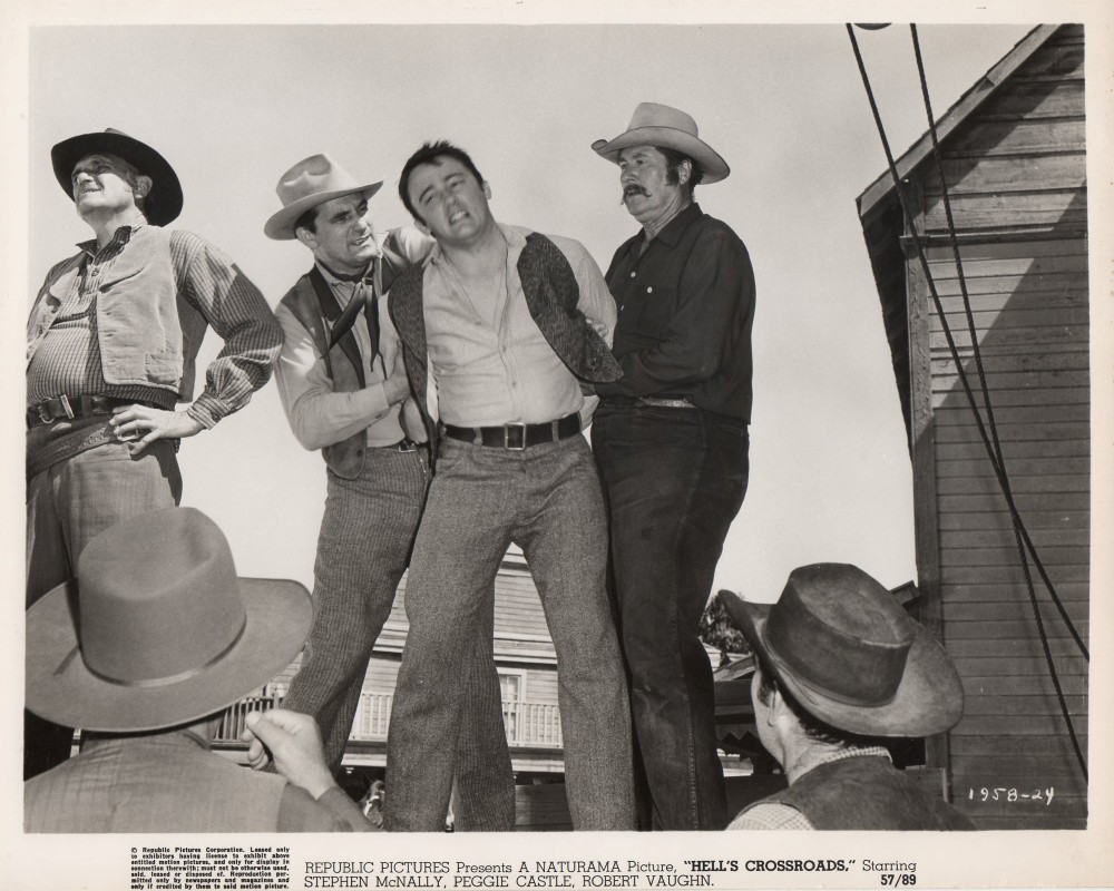 It starred Stephen McNally, then in his late 40s and showing it a bit. McNally had been a Universal contract player and was, notably, James Stewart’s villainous brother Dutch Henry Brown in Winchester ’73 in 1950. The studio had tried him out as Western lead in three pictures, Wyoming Mail (1950), Apache Drums (1951) and the very similar The Stand at Apache River (1953), but it didn’t really take and it was back to smaller roles. By the mid-50s he was appearing for various studios and in fact Hell’s Crossroads was his last lead in a feature Western.