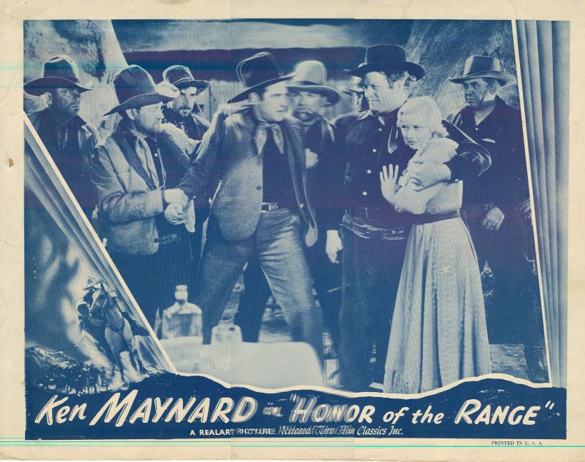We were talking the other day about Ken Maynard (pictured left), how he separated (with mutual relief) from Universal and made his first feature, In Old Santa Fe, for Nat Levine at Mascot. When Universal chief Carl Laemmle asked Maynard why his latest production was such a very bad picture, the frustrated Maynard retorted, “Mr Laemmle, I have made you eight very bad pictures.” But actually, those Universal Westerns were probably the high-water mark of Maynard’s career. He had successfully transitioned from silent star to the talkies and was, in the early 1930s, at the height of his popularity. The films were formulaic, yes, and very evidently low budget, but then so were 99% of Westerns in those days. Honor of the Range will do as well as any other as an illustration of the Universal Maynard talkies.