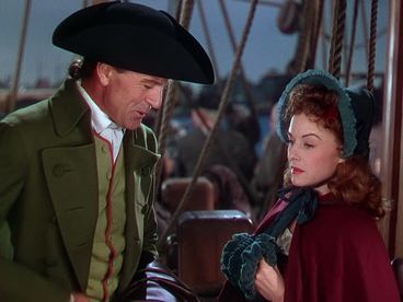 On board the Star of London crossing the Atlantic (in the studio, naturally) Abigail, known as Abby, catches the eye of wicked ship-owner Garth (Howard da Silva) who wishes to buy her and orders an auction. An army officer aboard, Captain Christopher Holden (Coop), outbids Garth in a memorable scene, adding “and sixpence” to every bid Garth makes. He doesn’t want the girl – indeed he frees her straight away – but he buys her to annoy Garth, whom he detests. However, once Capt. Holden leaves the docked ship, Garth gets his brutish henchman Bone (the excellent Mike Mazurki) to ignore the freedom and sell the girl again, to Garth. Such wickedness.