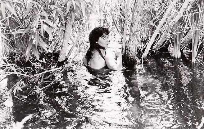 On his travels hunting down the murderer (he learns that the assassin is a member of the Checker gang) he comes across a girl bathing in a pool, as was standard in Westerns. Just enough flesh is shown to suggest that she is naked but not enough to scare the horses, i.e. the Arkoff formula.