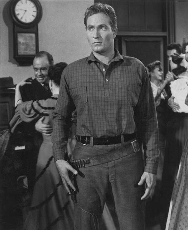 The ranchers have a hired gun, an illiterate thug who nevertheless wears a deputy’s badge, Jess Foley, played by Gregory Walcott (right), a square-jawed former Warners contract player who did a lot of TV Westerns but who started big-screen oaters in ’55 with this picture and another lady-in-town one, Strange Lady in Town with Greer Garson. The thing is, Deputy Foley and the would-be newspaperlady Prudence are supposed to feel a mutual electricity, a sort of fatal attraction. Alright, but even Barry Sullivan, whom she had semi-romanced in the first reel (but who has been written out of all the middle part of the movie), was nine years her junior. OK, true love knows no age and all that. But Walcott was almost young enough to be Colbert’s grandson and this part is implausible, if not even downright creepy. Walcott himself said, “I had done so many great films and worked with so many great directors that I didn’t want to be identified with such a piece of trash.” That was perhaps a bit harsh but he was right that his part in the movie was not terribly convincing.
