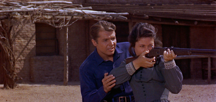 The lieutenant trains the women up, much as the gunmen were to do to the Mexican villagers in The Magnificent Seven three years later, teaching them how to shoot and preparing the ground for the coming attack. As in The Mag Seven there is an inexhaustible supply of enemies for the defenders to shoot down. The training scenes doubtless gave rise to much hilarity for the 1950s audience as Audie yells to the women, “Come on, men!” and the ladies hitch up their skirts ready to charge. In that innocent, pre-feminist day, audiences (male and female) could chuckle at the incongruity of ladies doing drill and shouldering arms. All this aspect is rather less funny these days.
