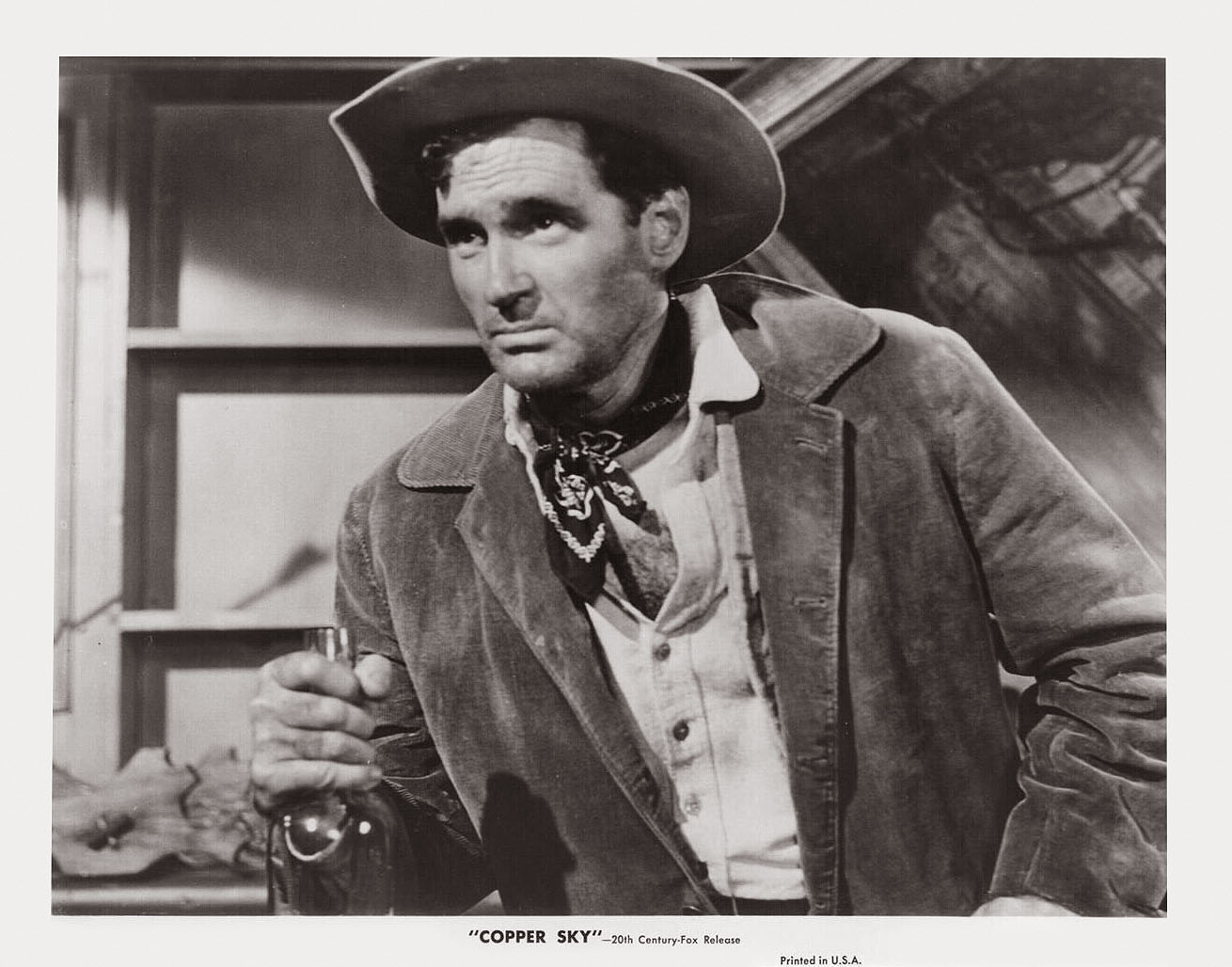 In Copper Sky he plays a hapless drifter, Hack Williams, in civilian life after a ten-year hitch in the cavalry, who arrives in a New Mexico or Arizona town (somewhere Apache anyway) and sees a person being shot by an Indian. He fires at the brave, who runs off, but when the townsfolk gather, and see him standing over the body with a rifle that has been recently fired, they of course immediately (as Western townsfolk were wont to do) jump to conclusions, assume he was the killer and then, led by a bloodthirsty woman, propose to lynch him on the spot. He is, though, at least given the semblance of a trial, a travesty of justice of course, before being sentenced to hang on the, er, morrow, at sunup. He is incarcerated till then, with Strother Martin as his jailer.