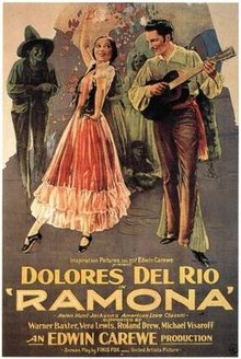 Ramona came back to the screen in 1928, towards the end of the silent era, just as talkies were becoming a thing. This was the first United Artists film with a synchronized score and sound effects, but no dialogue, and so was not technically a talking picture. In some ways this is the most famous version because it starred the exceedingly beautiful Dolores Del Rio as Ramona, and the hot property Warner Baxter as Alessandro. Furthermore, a song, Ramona, was recorded by Del Rio and it became a smash hit. It doesn’t feature in the story but Del Rio sang it at showings of the film and a record was often played of it when she was not present. You can listen to it, and see some great photos of Dolores at the same time, on YouTube here.