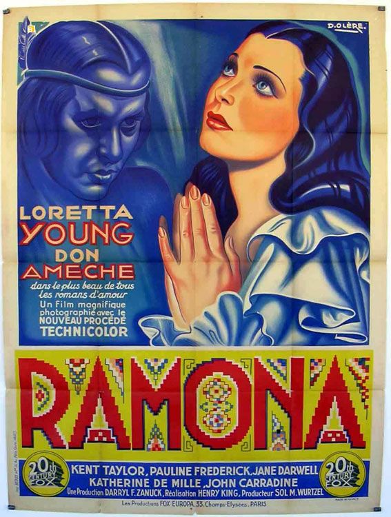 In 1936 Fox, which had purchased the rights to Ramona from Edwin Carewe, decided to do a big-budget talkie version in Technicolor, with Henry King directing (despite a 1935 news story saying that John Ford would do it) and, as the title screen announced, Darryl F Zanuck in charge of production. It starred Loretta Young as Ramona and Don Ameche as Alessandro (though Gilbert Roland was considered). The title role was to have gone to Rita Hayworth but Zanuck thought she was too juvenile. Young was a great beauty, who had started as a child actor in the early silent days and by the late 20s she was already a leading lady. Shooting on Ramona had to be delayed when she became pregnant by Clark Gable (they had starred together on Call of the Wild). A story was put out that she had become ill while traveling. She would later win a Best Actress Oscar. I remember her for Along Came Jones with Gary Cooper and Rachel and the Stranger with William Holden and Robert Mitchum.