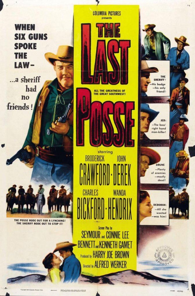 Hurray for Jeff! You actually liked Broderick Crawford in a Western. Jed Clayton(John Derek) asks, “How’s it feel to track down your friends?” Sheriff John Frazier replies, “Sheriff’s got no friends. Just a job.” Crawford does a good acting job as the honest and rather effective sheriff, although he is either drunk or hungover through most of the movie.