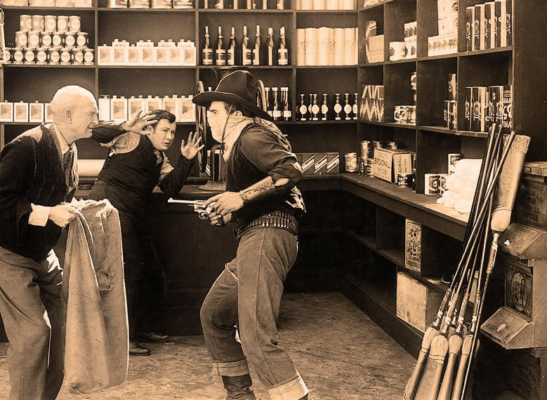 The story is set “in a remote district of Wyoming” as a title card tells us (The Virginian territory, the first film version of which had come out two years previous). We open with a trick roper (uncredited) twirling his lasso and we see old-timers “swappin’ stories” at the camp fire. They tell of the exploits of outlaw Passin’ Through (Fairbanks) who has a definite smack of Robin Hood about him. We see Passin’ Through holding up a train “but he took only the conductor’s ticket punch”, then he makes all the denizens of a saloon put their watches on a table and tells them that they must now grab their timepieces back but anyone who gets the wrong one must pay him five dollars (he leaves the saloon with a hatful of money which he gives to poor Yuma Kate), and finally he robs a grocery store (the grocers overact dreadfully) and gives the sack of goodies to young orphan Little Bill. We are told that Passin’ is “a queer cuss” who “makes a specialty of helpin’ kids that’s born in shame”.