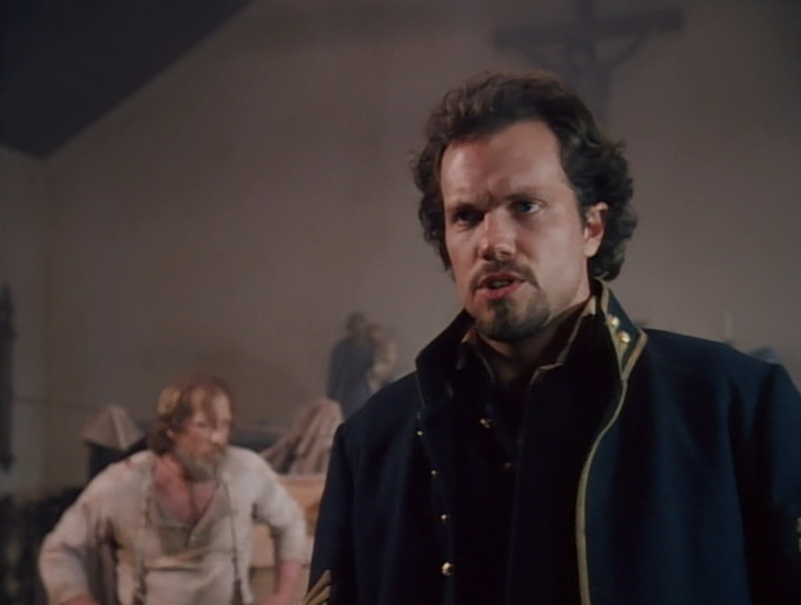 It’s a ‘treed town’ plot. A few soldiers under the command of a tough sergeant (Adam Baldwin, no relation to the Baldwin acting clan) are holed up, defending a shipment of silver, and a ruthless bandit chief (Robert Davi, from Licence to Kill) is going to take the town to get it. Obviously there’s a glam woman for the hero to canoodle with (Elizabeth Shue) and less obviously there’s a scurrilous priest (Ian McElhinney) who is in cahoots with the bandido. And there’s a crazy Indian shaman (Jimmy Herman, who was Stone Calf in Dances with Wolves and a particularly convincing older Geronimo in TNT’s 1993 Geronimo) who shows his opinion of the Christian priest by leaving a dead dog on the church steps, etc.