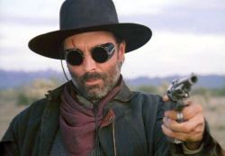 It was a mid-90s HBO movie, so could go for violence and the occasional bared breast and so on. It wasn’t very good, in all honesty, though is just about watchable. The hero, or central character anyway, Canaan, was blinded in the war (we see flashbacks of the horrors of conflict; he somehow landed in a mass grave and had lime tipped over him) yet can now shoot with unerring accuracy. At one point he hears a scorpion crawling near a man and shoots it to stop the critter stinging the fellow. A likely story. Canaan is played by Armand Assante, who was, in fact, one of the better things about the more recent Western The Man Who Came Back, in which he was the bad guy. He was apparently Belizaire the Cajun in 1986, though that is not a movie I know. Not a Western, you see. Now he is a blind bounty hunter, dressed all in black. There’s more than a hint of Jonah Hex about his character.