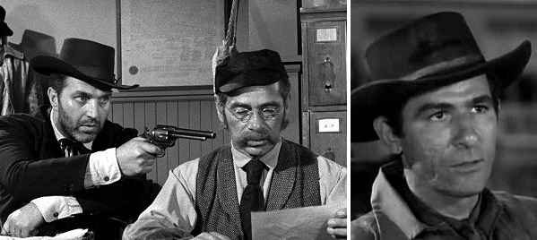 Now, Kit has a pal, Frank, the sheriff’s son, and they are best friends, I guess, but unfortunately they both pine for the same gal, Lucy (another non-Western specialist, Abby Dalton, whom the IMDb bio describes as “sleek and striking”, admiring her “perky and sexy presence” – are we sure that’s still OK these days?) and so of course there are strains in the bromance between Kit and Frank. Frank is played by Jan Merlin, an alumnus of Grace Church Choir School for Boys yet nevertheless habitually portraying slimy and/or vicious bad guys). He will turn out to be a snake in the grass, even more loathsome than the State Police captain and sergeant, whom he will in fact callously slay, blaming it on Kit, the swine. All to get Kit out of the picture so that he may lay lustful hands on the fair Lucy.