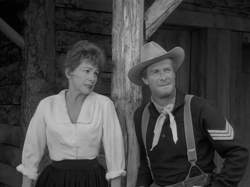 There has to be some love interest, of course, and that is provided by a remarkably stupid traveler, played by Hungarian actress Hanna Landy, and her daughter (Cheryl MacDonald). They are, very improbably, traveling alone across Indian territory. Early in the movie their wagon is chased by Indians and the dumb mother tells the girl to run, so that she is, inevitably, caught by the pursuers and raped (though it’s 1950s in style, not 1960s, so we don’t actually see that part; we just get some overacting in the reaction shots). The mother will be attracted to the brave sergeant, and, let it be said, vice versa, and sure as eggs is eggs, they will go off together at the end for a new life. Actually, quite a few of the characters do seriously dumb things, so that you want to cry out, “Don’t!”, or at least you say, “Doh.”