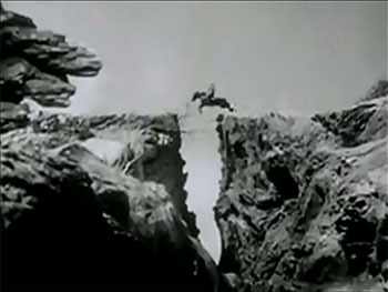 Shark grabs the fair Beth (Vivian Austin) and hijacks the stage to abduct her (a pretty lowdown trick, you will agree) and, informed by Beaver, Red gives chase, allowing the chapter to end with a real cliffhanger. Cliffhangers were, as you know, an integral part of these serials. This one is almost literally a cliffhanger. The stage teeters on the edge of the abyss, with Red and Beth inside (and Shark too, actually). Will they all fall to their doom? NEXT WEEK…