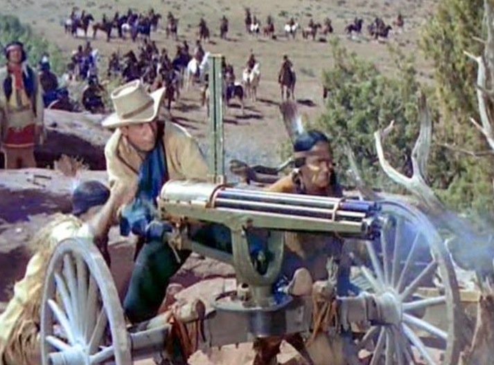 Maté’s next Western was for Fox in 1954, The Siege at Red River. It was unusual as a Western in that it starred Van Johnson, better known as an MGM song-and-dance man. It’s a Civil War tale of a villain selling a Gatling gun to the Indians, who use it in an attack on a fort. If Van wasn’t quite the man, fortunately this villain was none other than the great Richard Boone, and